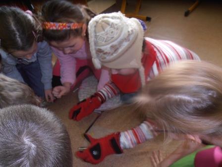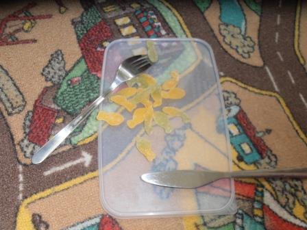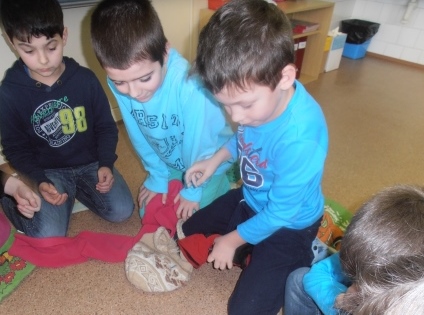 Rozdelili sme sa do dvoch skupín a posadali do kruhu. V každom kruhu kolovala jedna kocka, ktorou sa jednotliví hráči usilovali hodiť šestku. Ten, komu sa ju podarilo hodiť, sa začal rýchlo obliekať do pripravenej kopy oblečenia - čiapky, šálu a lyžiarskych rukavíc. Potom schytil príbor a pustil sa do jedenia. My sme si za typické námornícke jedlo zvolili rybičky. Keďže sme sa báli drobných kostí, nesúťažili sme so skutočnými, ale so želatínovými rybkami.